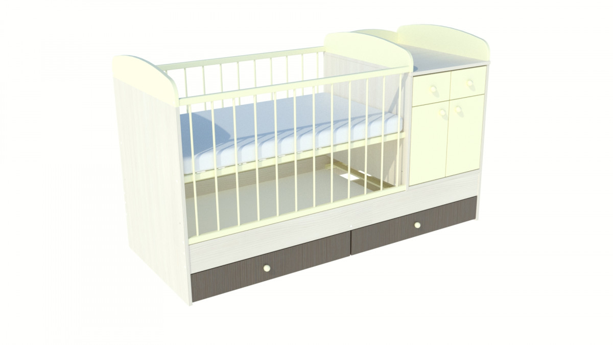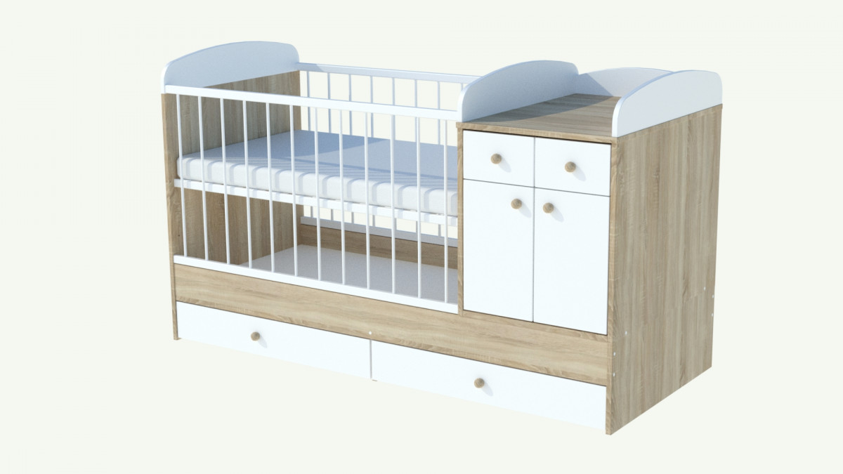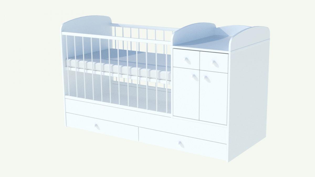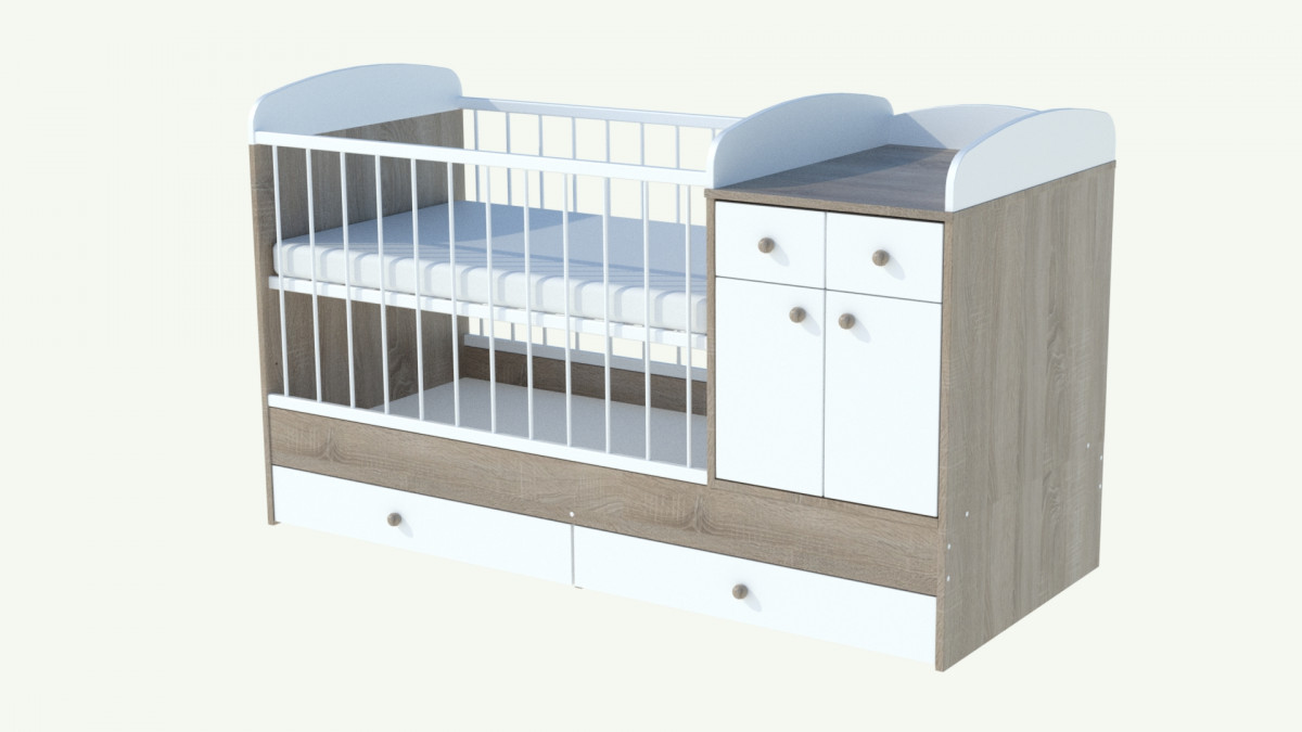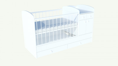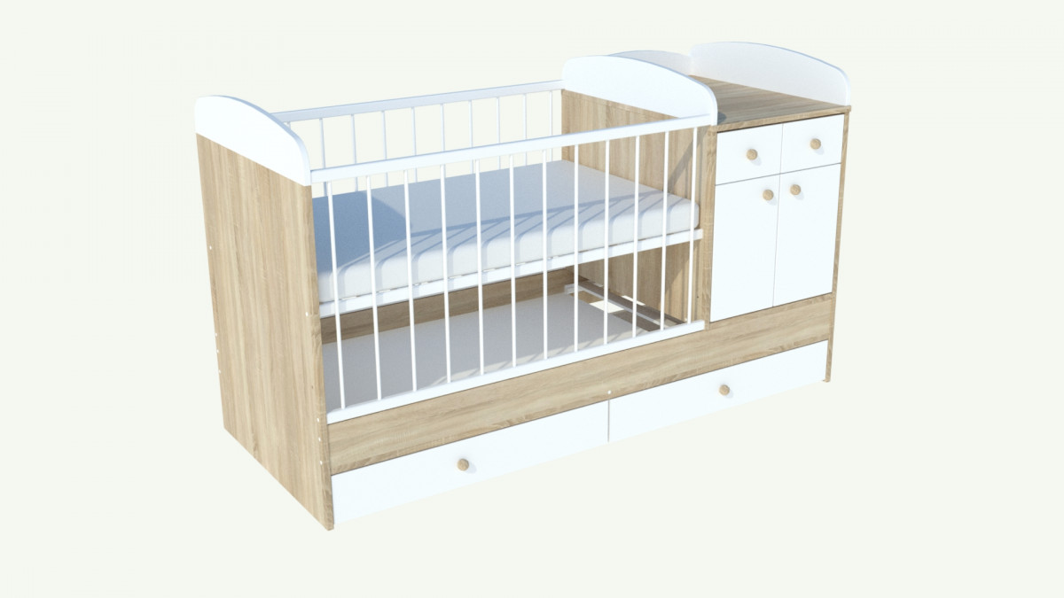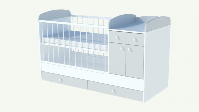 - 3 funkciós kombi kiságy, egy fiókkal és egy kétajtós egypolcos tárolórészekkel, alul két ágyneműtartó fiókkal.