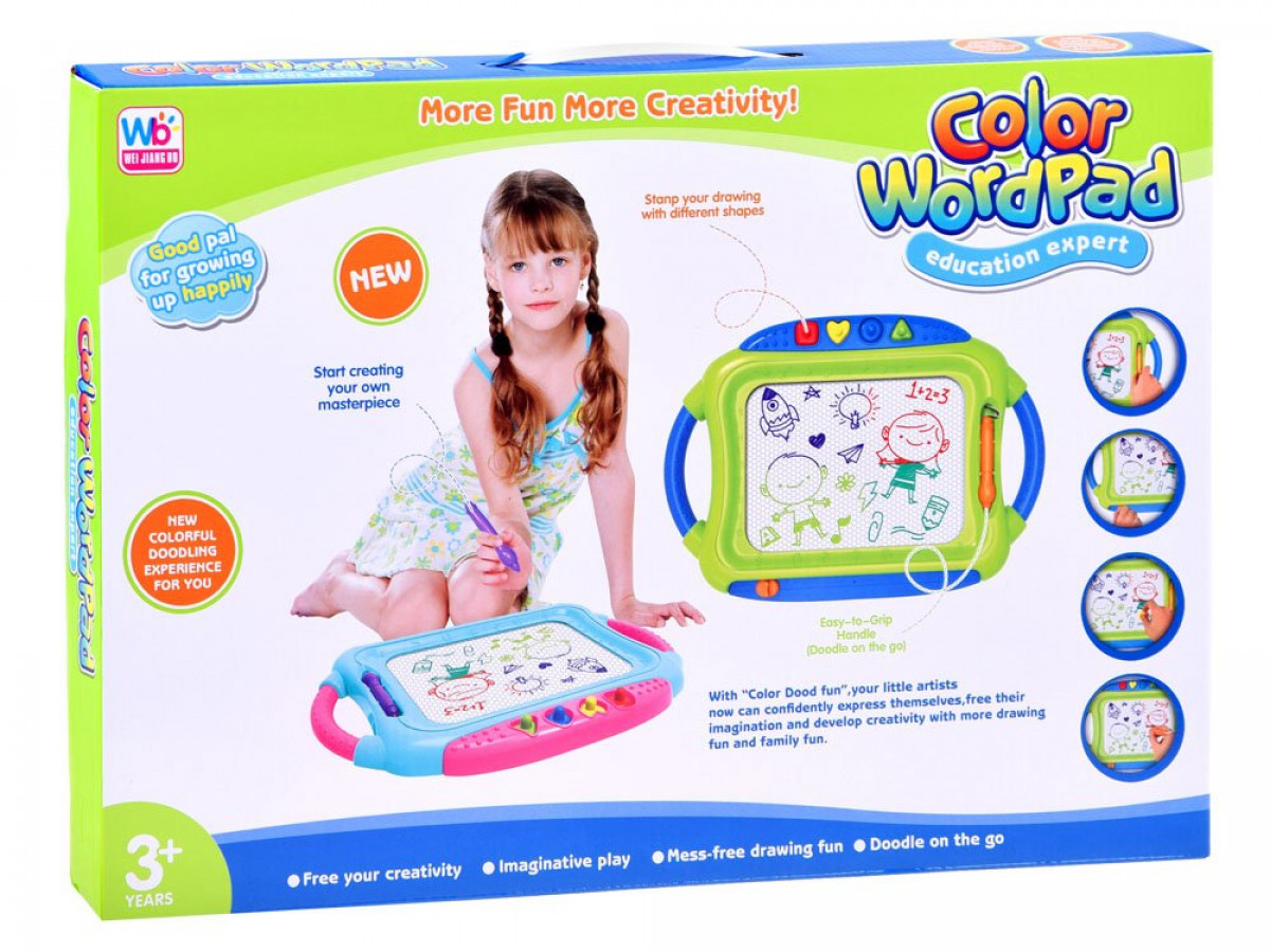 A tábla háttere rajzolás közben sokszínű, attól függően, hogy hol írsz vagy festesz. A bélyegeket festésre is használják. Ha a rajz megunta a gyermeket, vagy nem tetszik neki, egyszerűen törölheti egy csúszó jelölővel. Az eltűnéssel való játék remek megoldás lesz az unalmas estékre. A táblára festhet, írhat ceruzával vagy bélyegzőmintákat. A geometrikus alakzatú bélyegek vonzóbbá teszik rajzait. A kreativitás és a találékonyság lehetővé teszi, hogy különféle formákat és karaktereket hozzon létre.